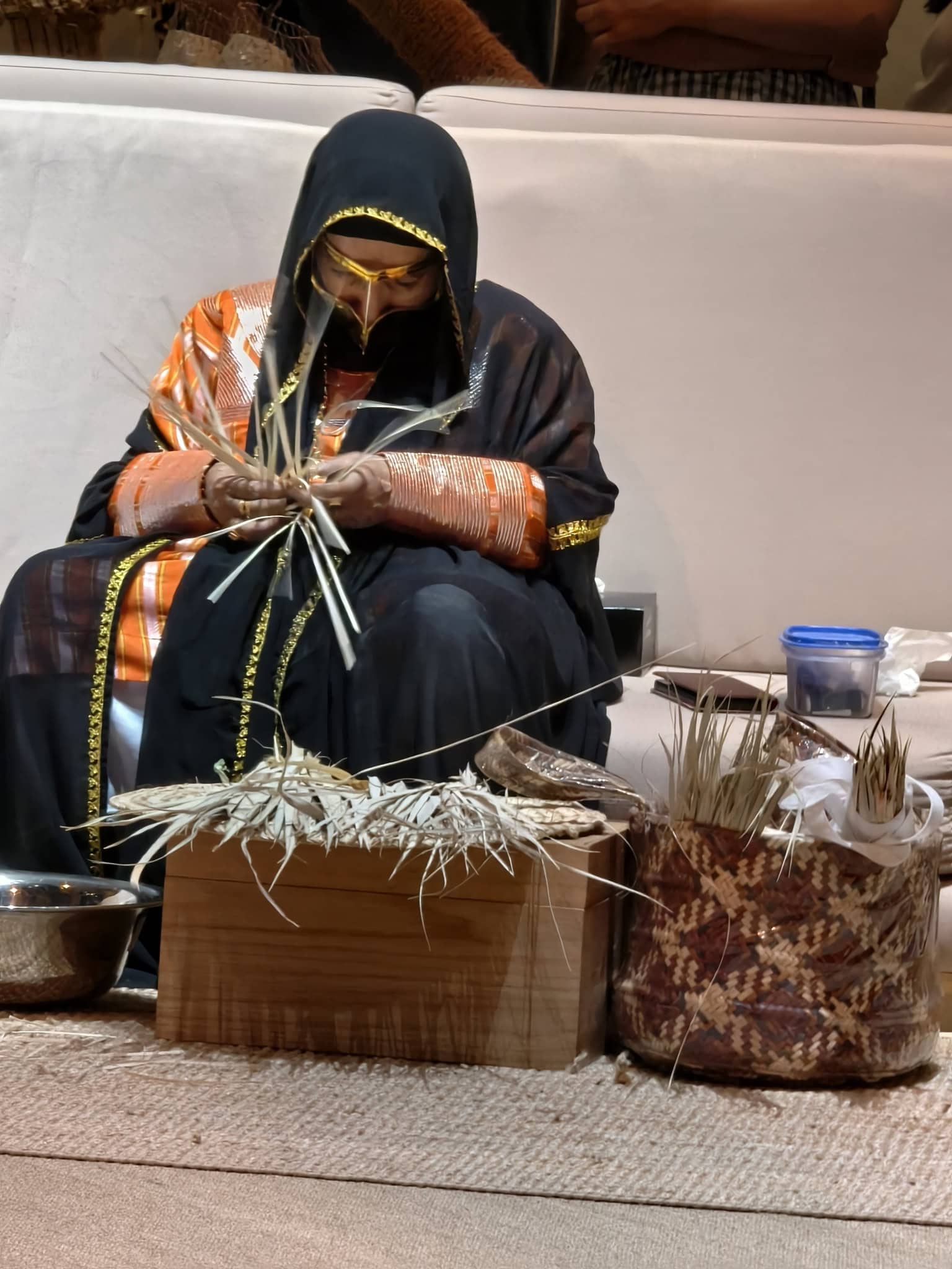 She is making something from date palm fronds. A date palm is the main crop in the region. It really has been giving life to local tribes as it provides food, craft materials, construction resources, you can create baskets, mats, ropes of that. Date palms are everywhere wherever they could grow.